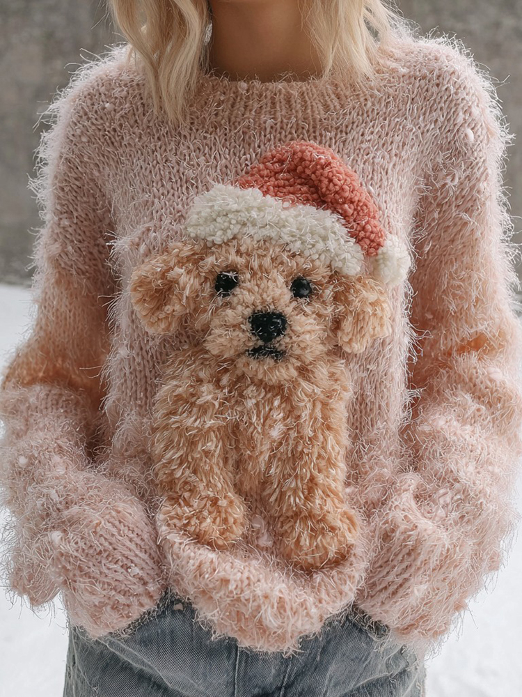 Classic Fluffy Cute Dogs With Floral Felt Art Inspired Embroidered Cozy Knit Sweater Cardigan