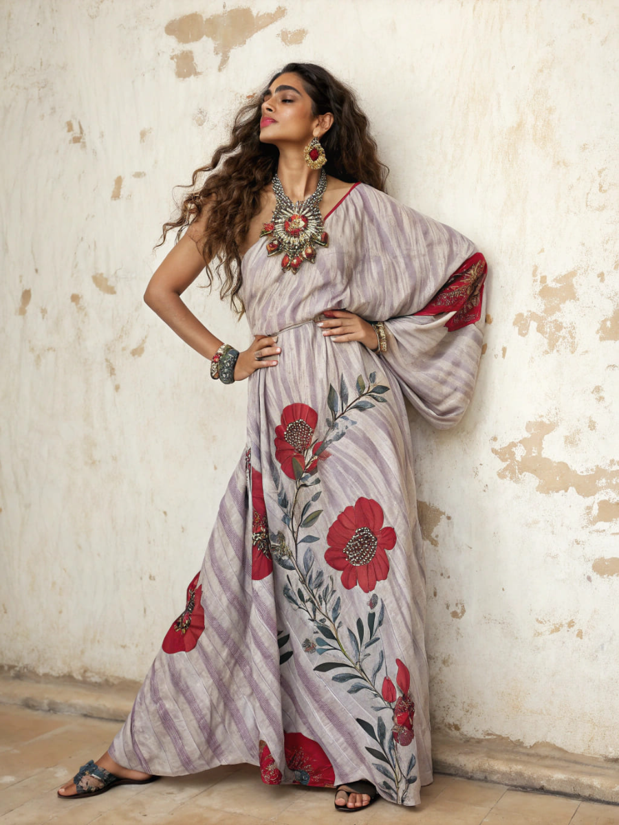 Cotton and Linen Colorful Floral One Shoulder Maxi Dress