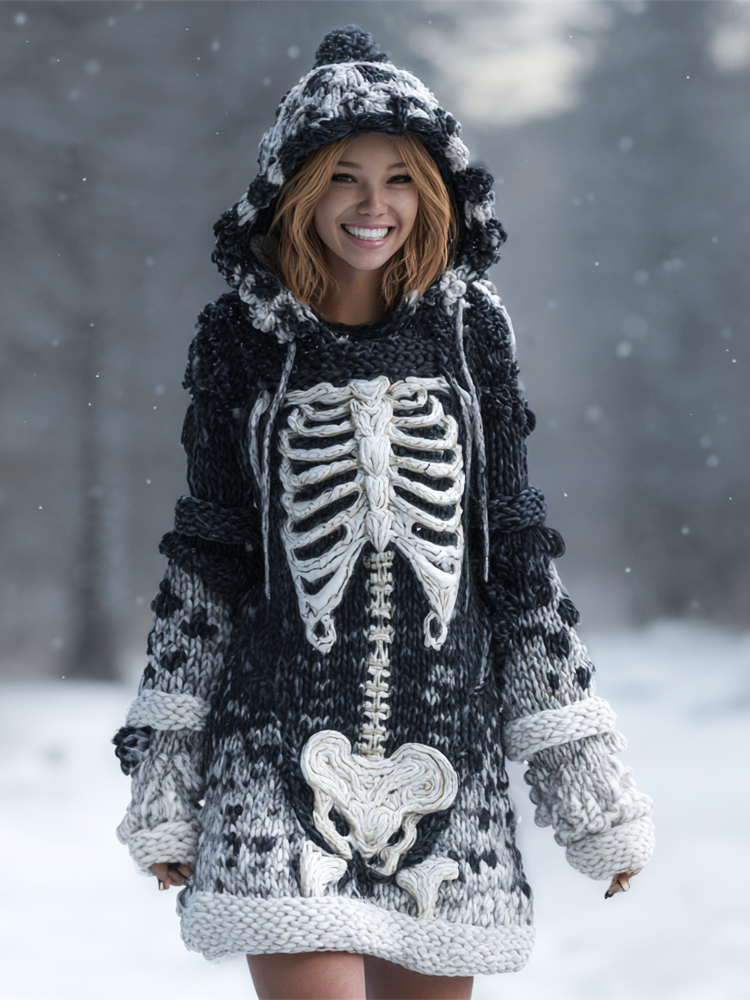 Day Of The Dead Skeleton Women's Chunky Knit Twist Hooded Sweater Dress