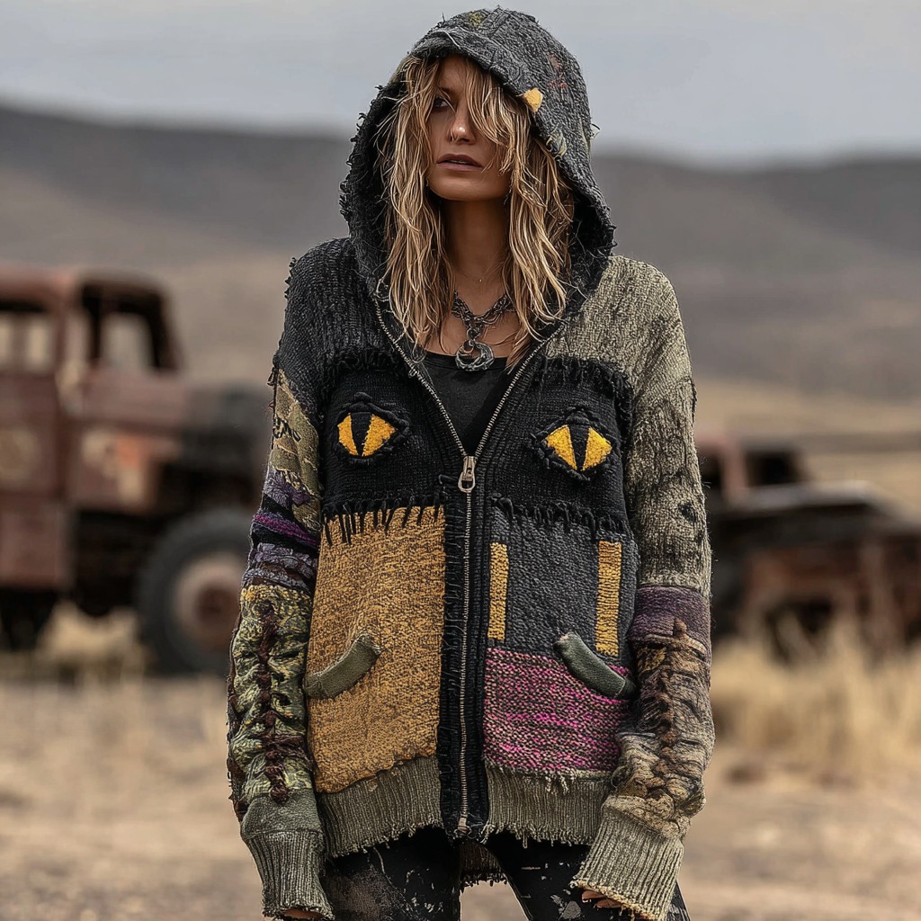 Halloween Black Cat Eye Knitted Patchwork Color Block Warm Zipper Sweater