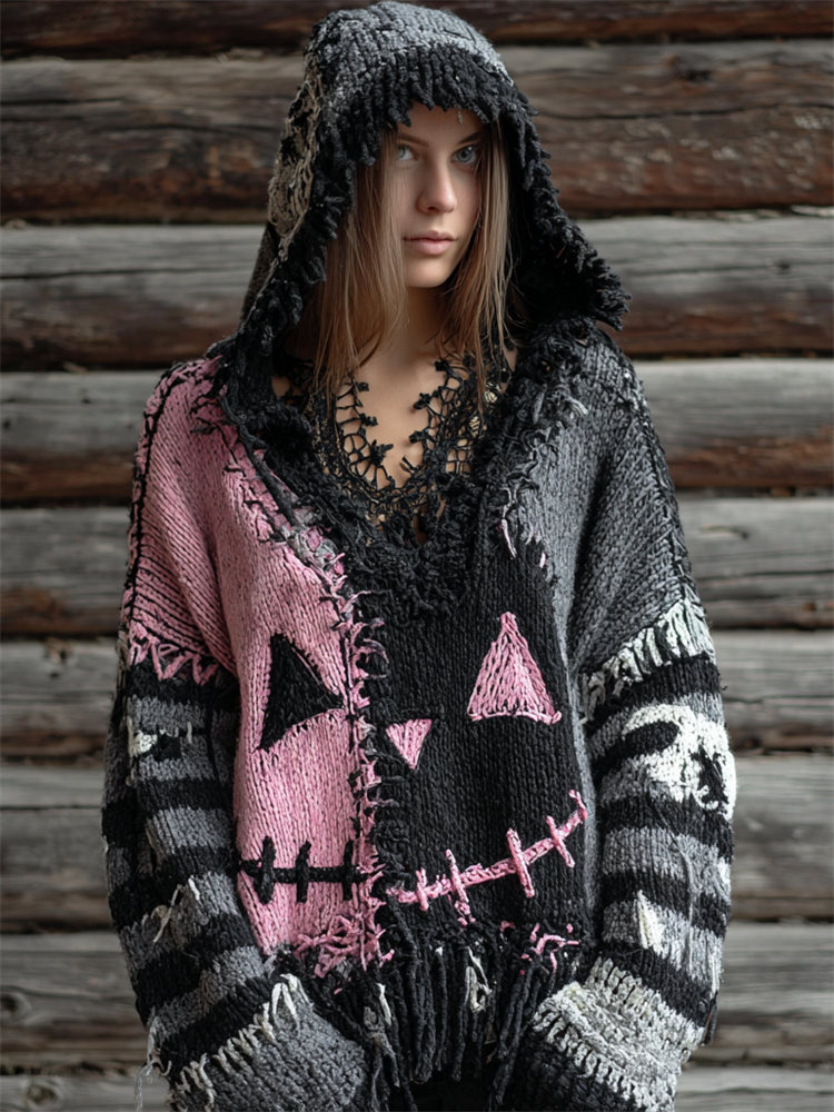 Halloween Pumpkin Face Colorblock Stitched Knit Hooded Sweater