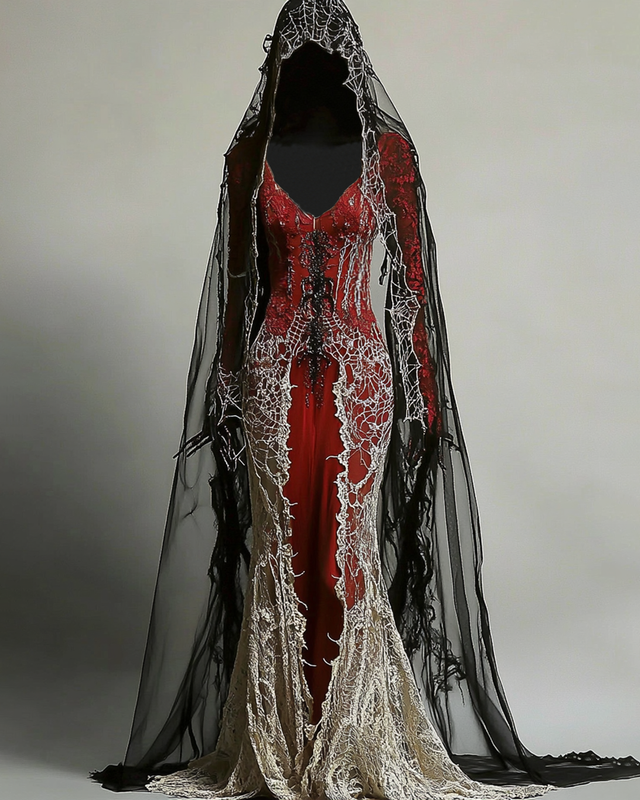 Halloween Themed Contrasting Spiderweb Embroidered Lace Dress a47a