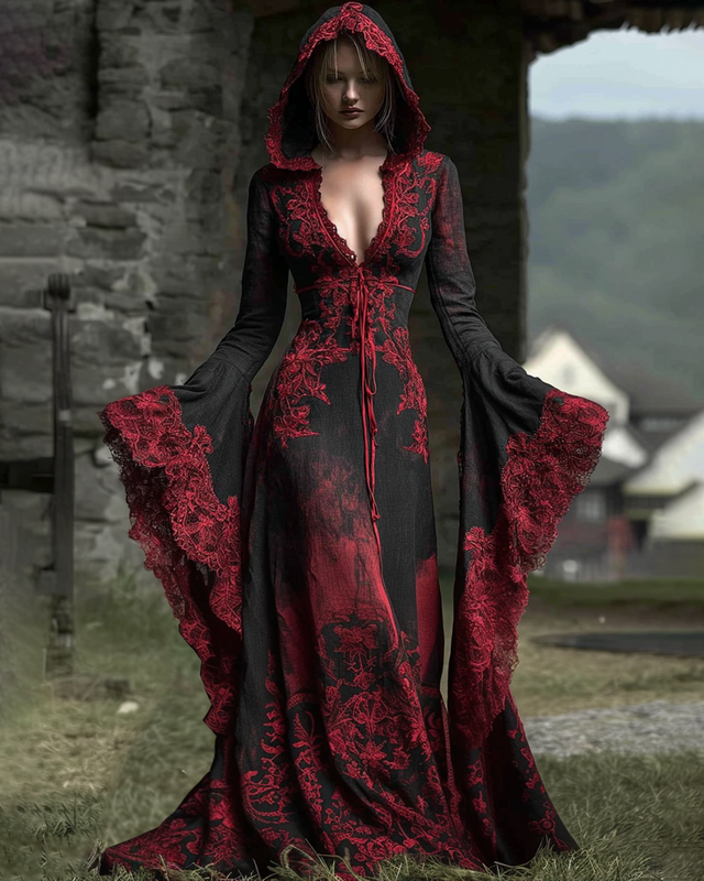 Halloween Themed Irregular Lace Patchwork Hooded Dress 7870