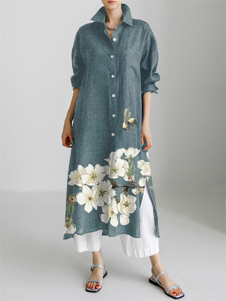 Japanese Art Bee And Flower Print Long Sleeve Slit Shirt Dress