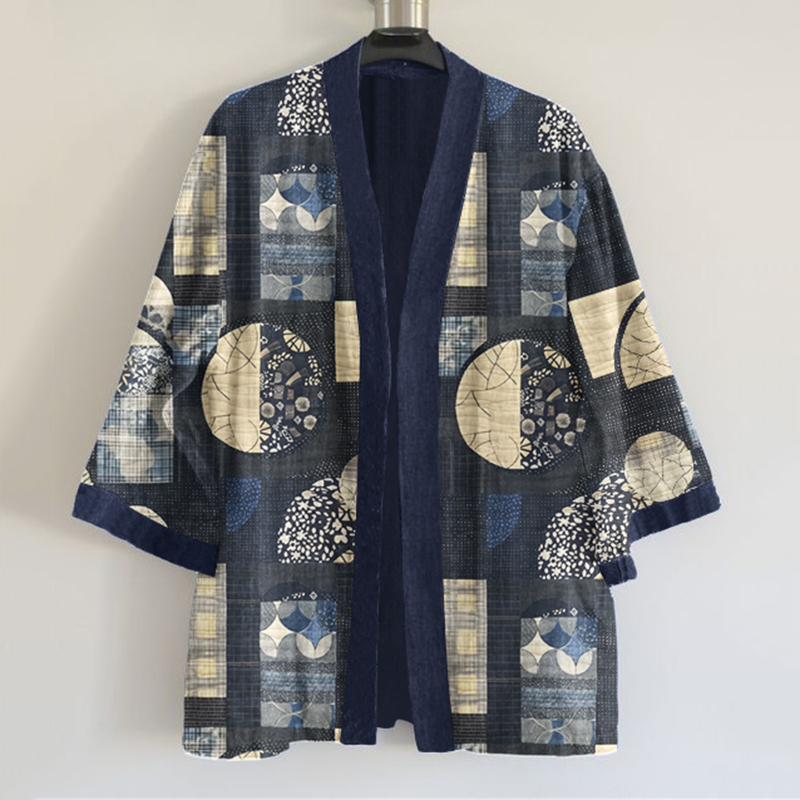 Japanese Traditional Sashiko Art Pattern Art Print Linen Blend Kimono Cardigan
