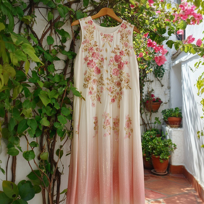 Elegant Flowers Embroidered Pink Gradient Linen Midi Dress