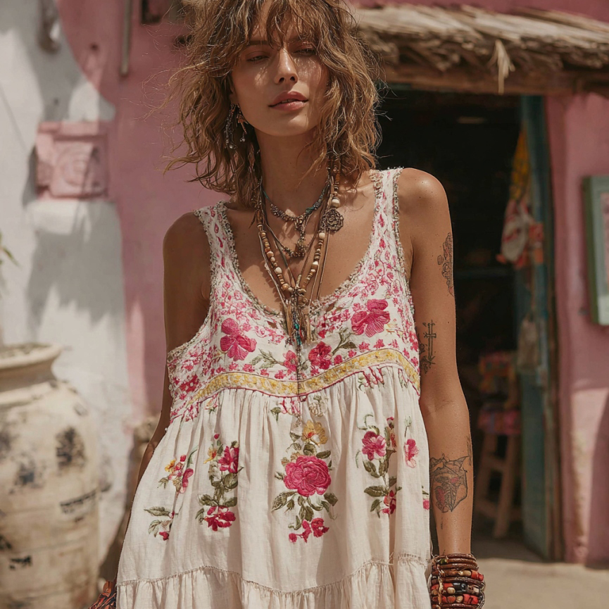 Pink Rose Embroidery Crew Neck Linen Blend Tank Top