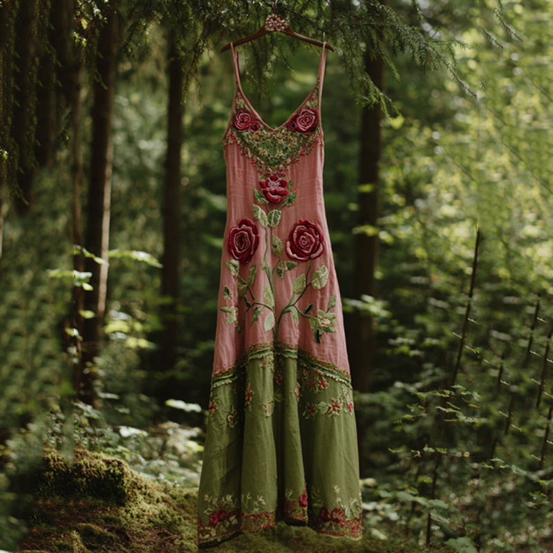 Vintage Classy Boho Gradient Pink Roses Embroidered Linen Suspender Dress