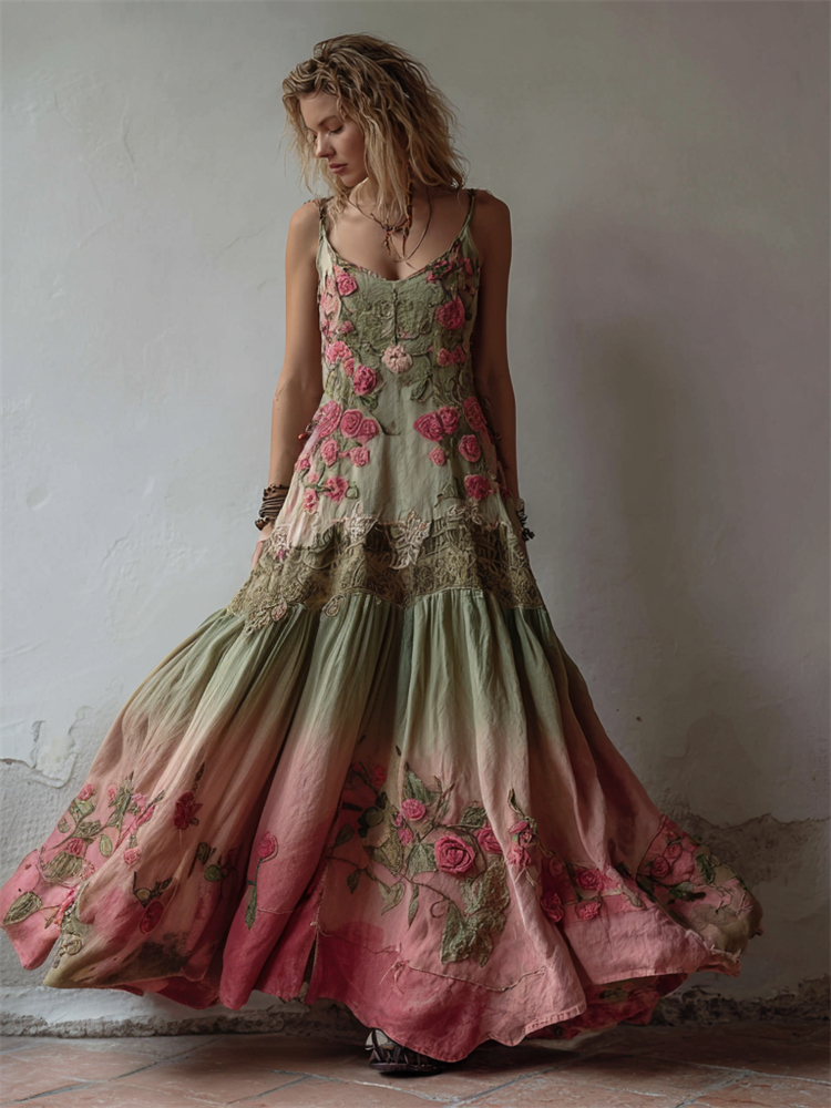 Vintage Pink Roses Natural Gradient Flowy Linen Maxi Dress