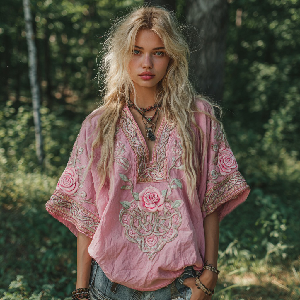 Women's Pink Rose Celtic Knot Art V Neck Linen Comfy T-shirt