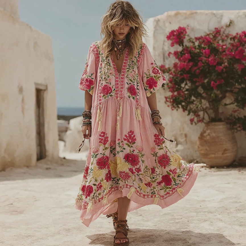 Women's Pink Rose Embroidery Bohemian V-neck Linen Blend Midi Dress