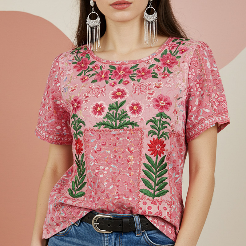 Women's Retro Pink Plant And Floral Embroidered Print T-shirt