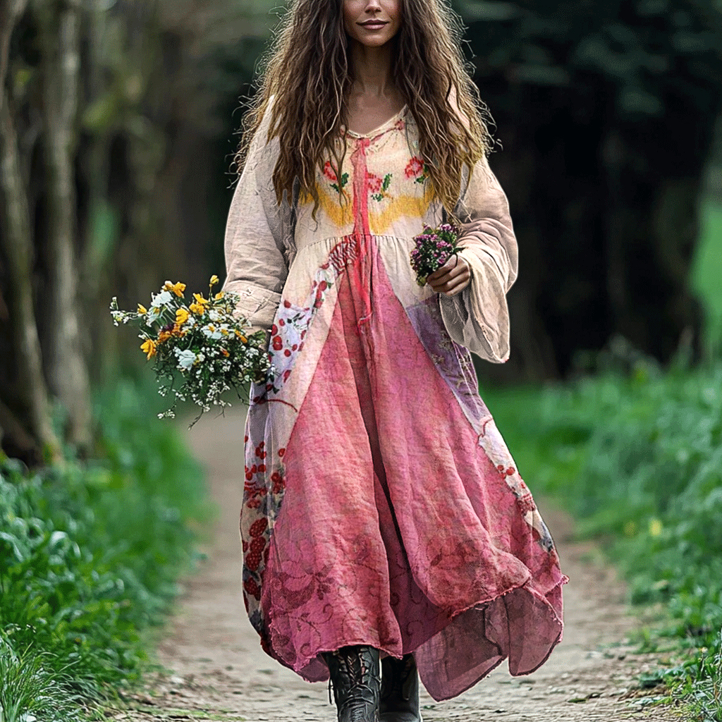 Women's Vintage Floral Art Linen Blend Maxi Dress