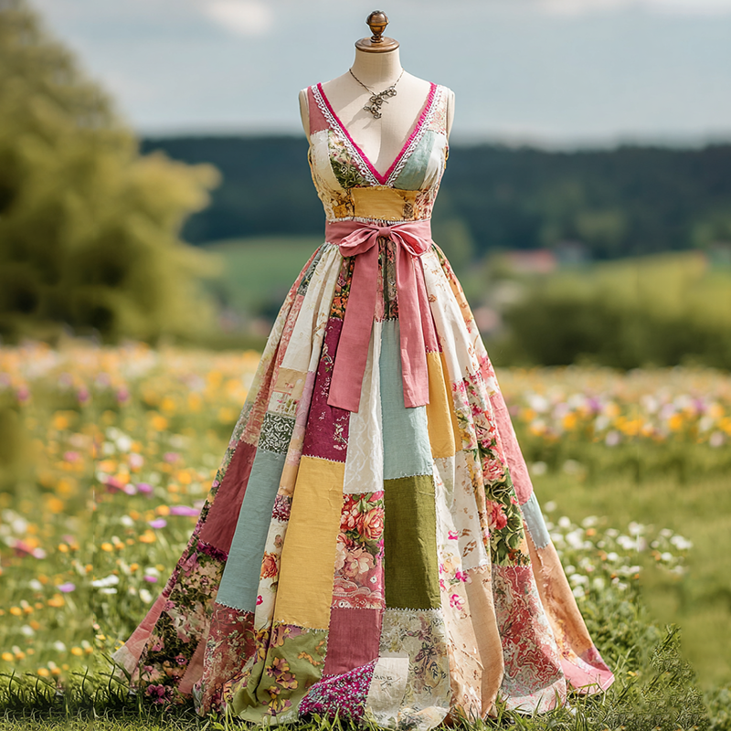 Women's Vintage Floral Art Patchwork V Neck Comfy Maxi Dress