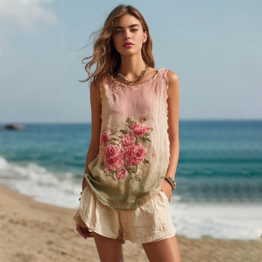 Women's Vintage Floral Embroidery Art Linen Comfy Sleeveless Top