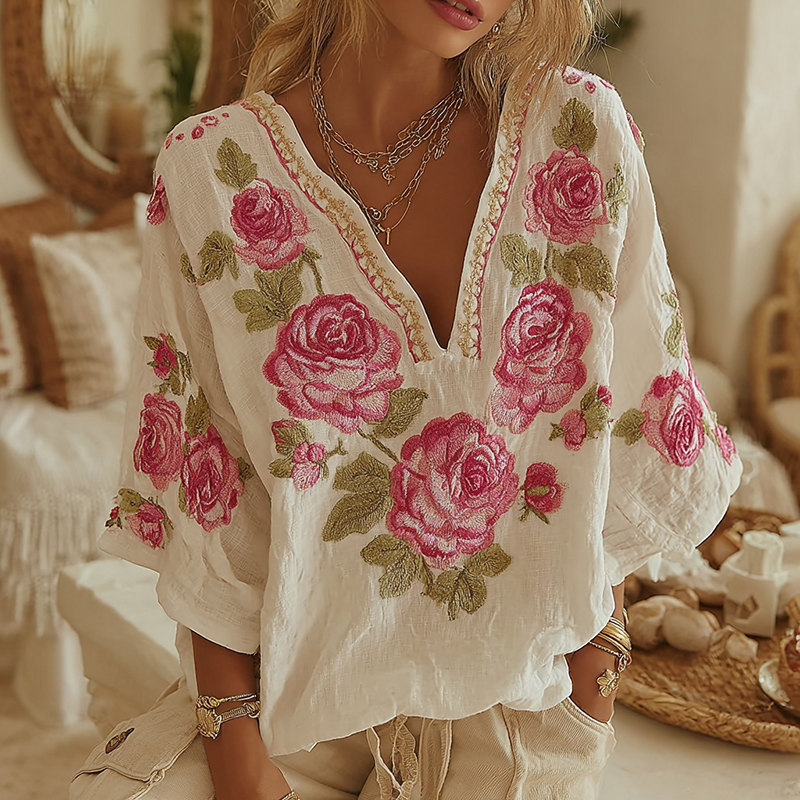 Women's Vintage Floral Embroidery Art V-neck T-shirt