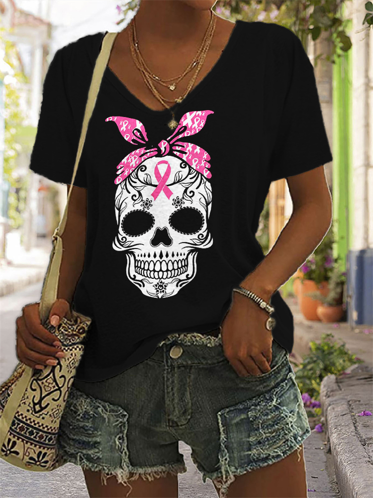 Pink Ribbon Bandana Skull Print Casual T Shirt
