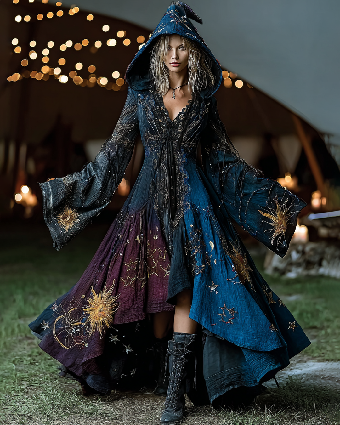 Star And Moon Themed Embroidery Gradient Hooded Witch Dress 4be7