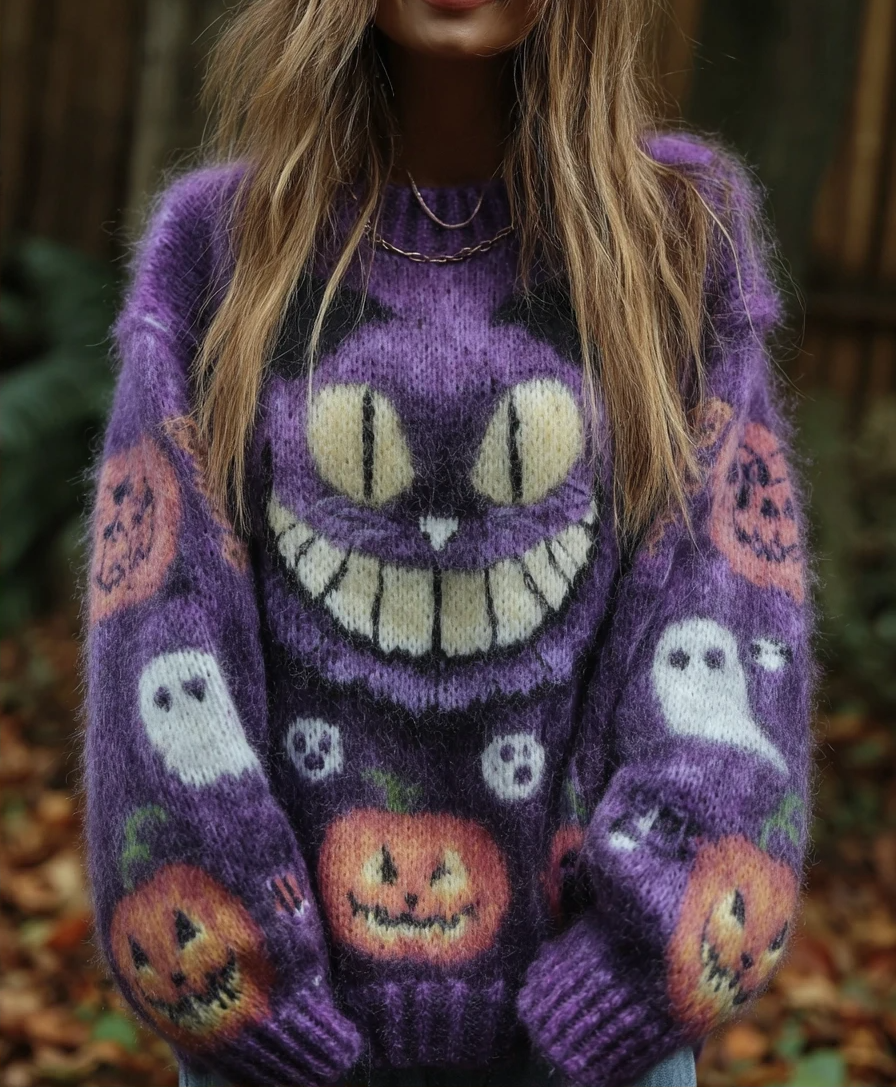 Women's Casual Vintage Halloween Pumpkin Face Embroidered Sweater