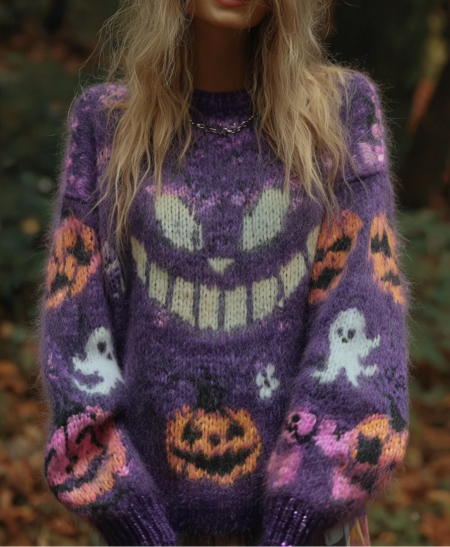 Women's Casual Vintage Halloween Pumpkin Face Embroidered Sweater