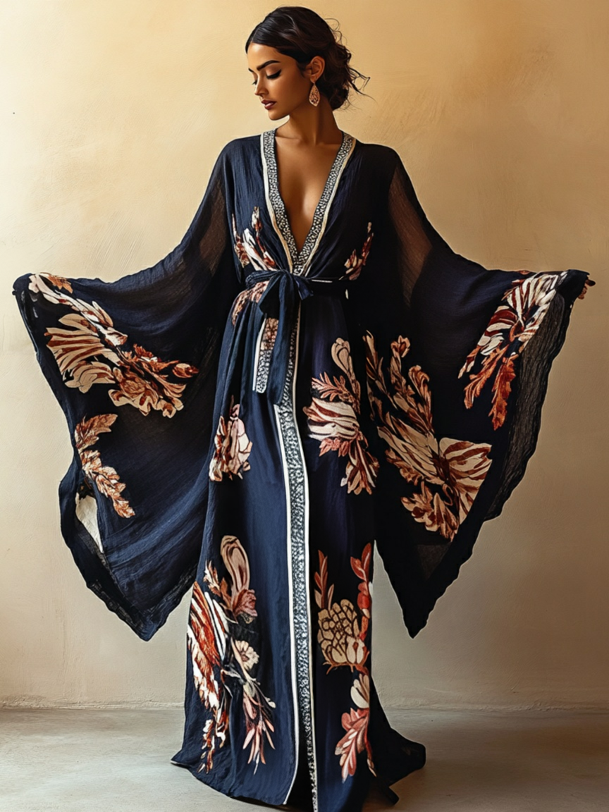 Women's Black Art Print Kimono Linen Robe (Including Belt)
