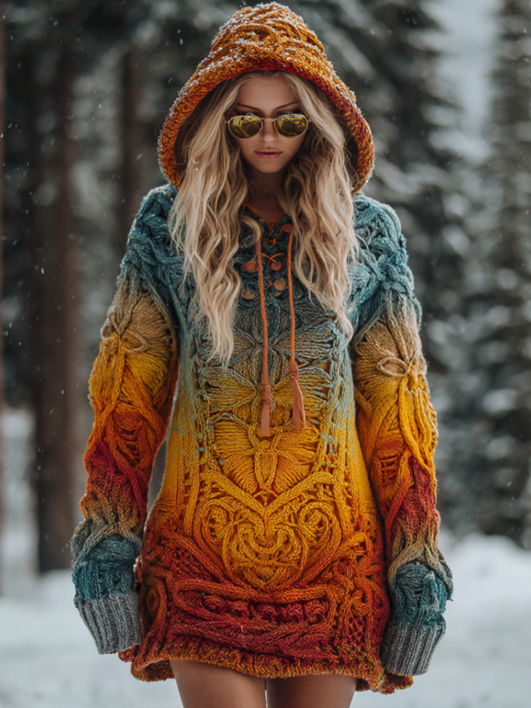 Women's Gradient Color Hooded Long Sweater With Viking Style Tribal Totem